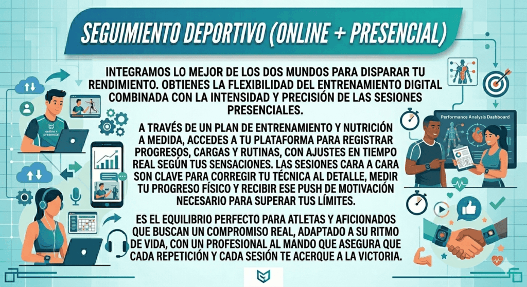 Nuestro servicio de Seguimiento Personal ofrece un sistema híbrido diseñado para maximizar tus resultados combinando la flexibilidad del asesoramiento online con la efectividad de las sesiones presenciales. A través de una planificación 100% a medida, tendrás acceso a una plataforma digital para gestionar tus progresos 24/7 y contacto directo para resolver dudas en tiempo real, sin renunciar al valor del trato humano y la corrección técnica que solo el encuentro físico puede dar. Es el equilibrio perfecto para quienes buscan un compromiso real, adaptado a su ritmo de vida y con el respaldo constante de un profesional que asegura que cada paso cuente.